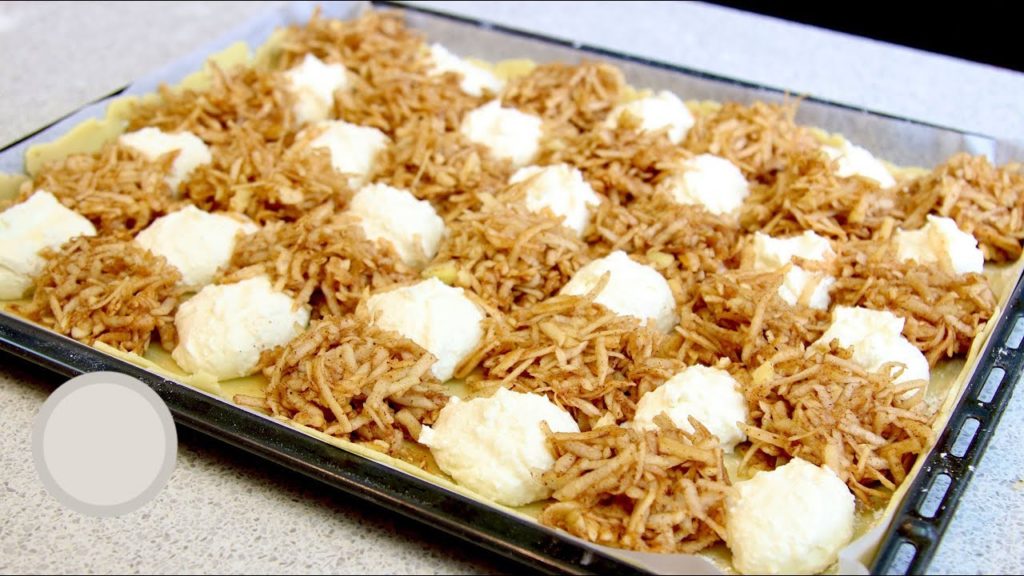 Rozwałkowane ciasto układamy na blaszce, wyłożonej papierem do pieczenia. Teraz z masy twarogowej i jabłek tworzymy wzór szachownicy na cieście. Na zmianę kładziemy łyżkę masy twarogowej i startych jabłek.