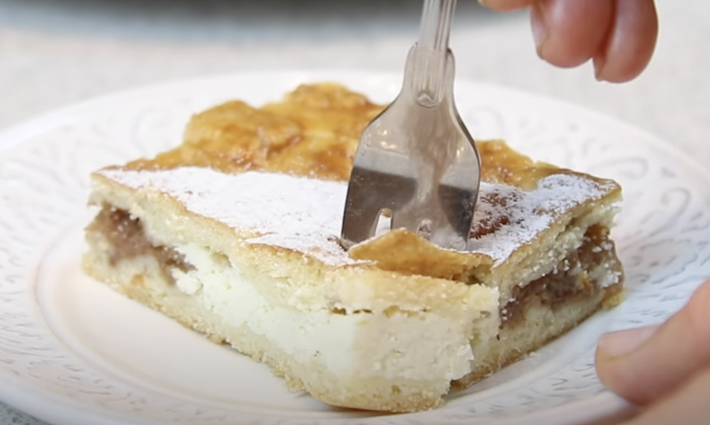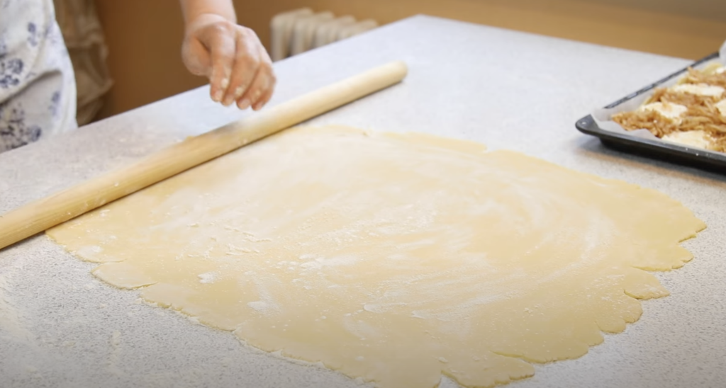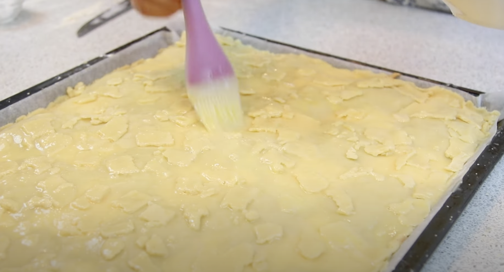 Przyszła pora na wykorzystanie drugiej części ciasta. Ciasto rozwałkowujemy i delikatnie układamy na nadzieniu. Wystające części ciasta można ostrożnie obciąć nożem i ułożyć na wierzchu. Ciasto nakłuwamy widelcem, aby zapewnić dostęp powietrza. Całość smarujemy rozbitym jajkiem.