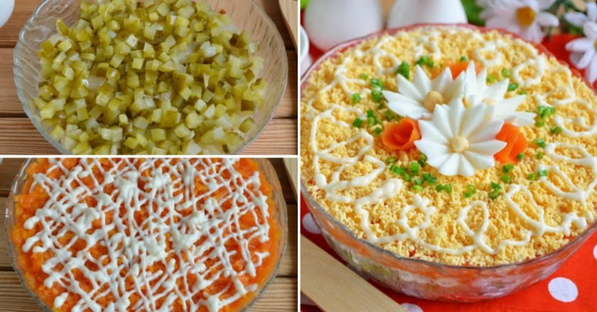 3.Warstwami układaj sałatkę: Na sam dół połóż wątróbkę, posmaruj ją majonezem, później podsmażona cebulka, znów majonez, następnie ogórki oraz starte białka, ponownie majonez, marchew starta, znów majonez, a na samą górę na tarce starte żółtka. To wszystko!