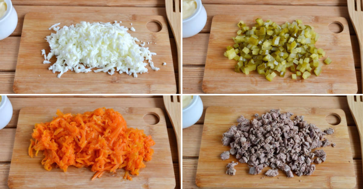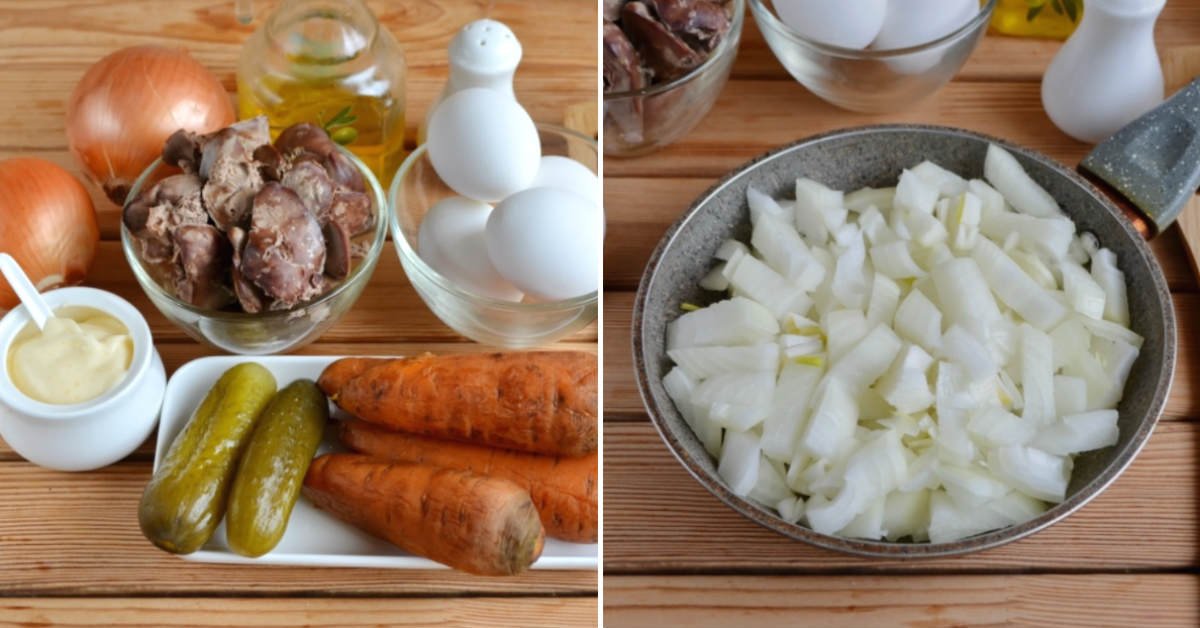 2.W osolonej wodzie ugotuj marchew oraz drobiową wątróbkę do miękkości. Na patelni z dodatkiem oleju podsmaż obraną oraz drobno pokrojoną w kosteczkę cebulę, na złoty kolor. W drobną kosteczkę pokrój również ogórki , a na tarce o grubych oczkach zetrzyj marchewki. Drobno posiekaj ugotowaną wątróbkę.