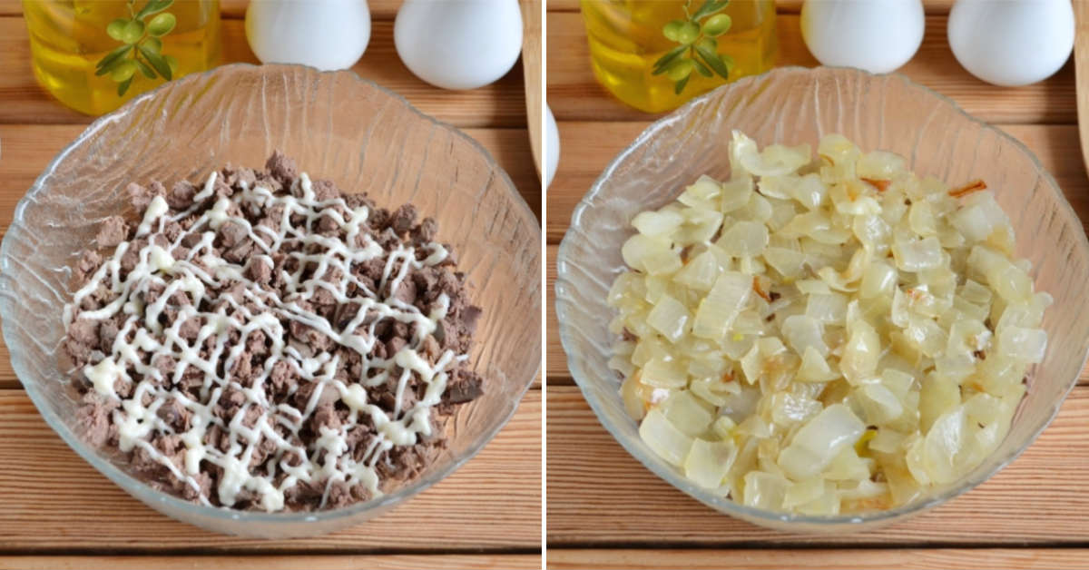 Warstwowa sałatka z wątróbki- takie połączenie składników sprawia, że każdy będzie chciał ją skosztować.
