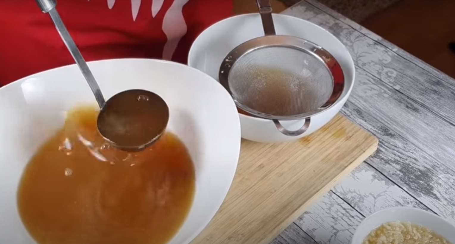 Następnie należy odcedzić czosnek z odlanej części bulionu, i po raz trzeci przecedzić cały bulion przez sitko z czosnkiem.