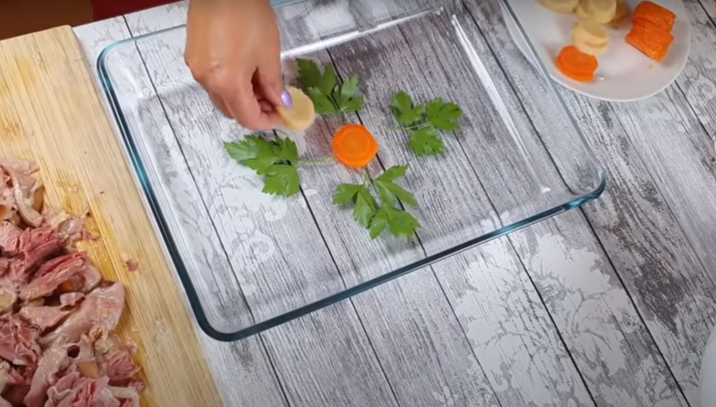 W tym celu na dnie dużego naczynia ułóż liście pietruszki i pokrojone w plasterki ugotowane warzywa – od tego jak ułożysz warzywa będzie zależał wygląd Twojej galarety, więc warto się postarać.