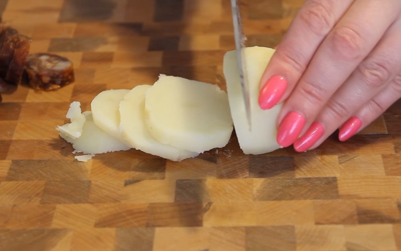 1. Ziemniaki ugotuj w mundurkach, ostudź, obierz ze skórki i pokrój w plastry o grubości 5–6 mm.