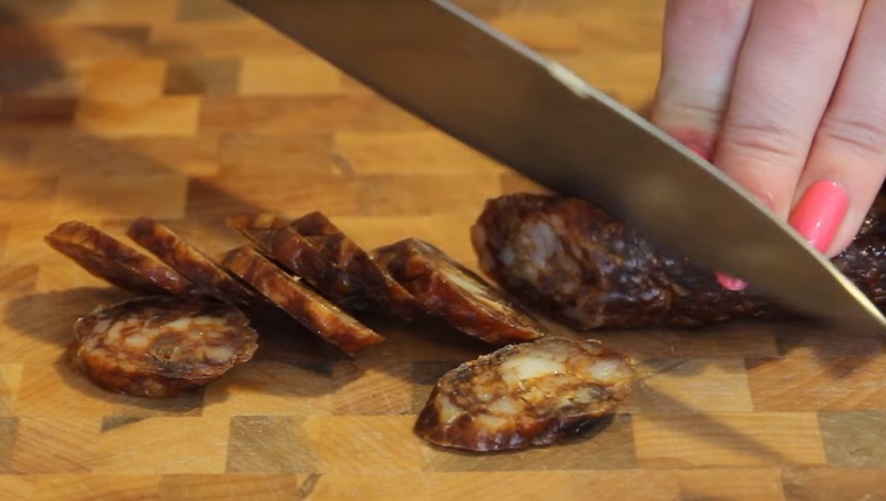 3. Kiełbasę bez skórki pokrój w plastry lub pół-plastry, jeśli jest gruba.