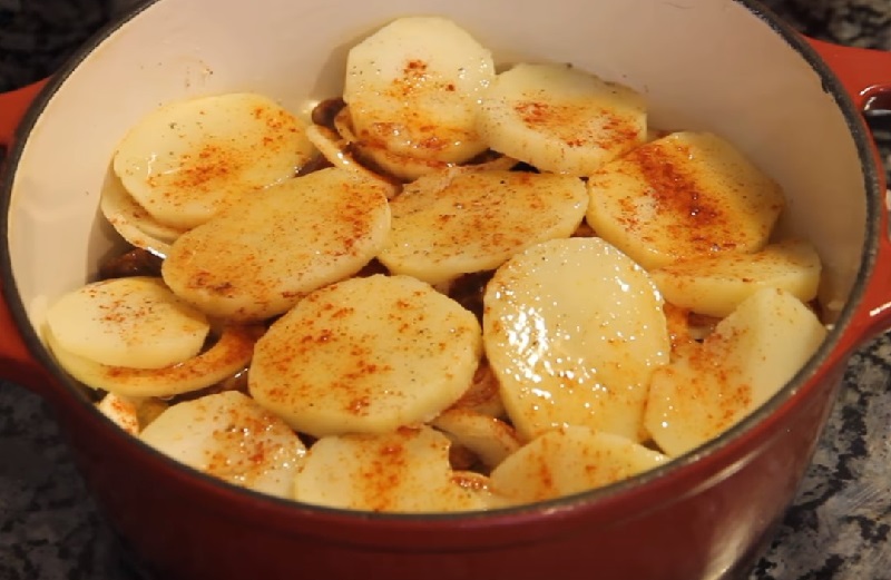 6. Przykryj naczynie pokrywką lub folią i piecz w piekarniku rozgrzanym do 200 stopni przez 15 minut. Pod koniec zdejmij pokrywkę i piecz jeszcze 10-15 minut, aż ziemniaki i ser na wierzchu się zarumieni.