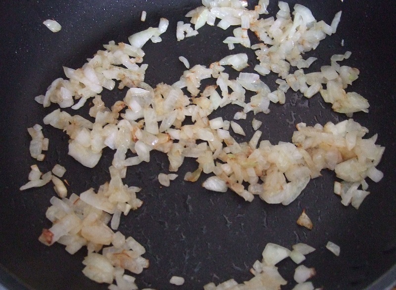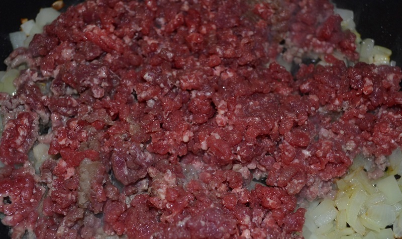 4. Podsmaż cebulę na rozgrzanej patelni z olejem, a następnie dodaj do mielonego mięsa i wymieszaj. Dopraw solą i pieprzem do smaku.