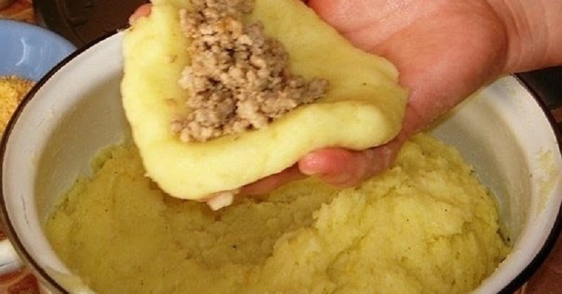 6. Uformuj z masy ziemniaczanej zgrabne kulki, potem delikatnie je spłaszcz. Na środek każdego, nałóż łyżkę farszu mięsnego.