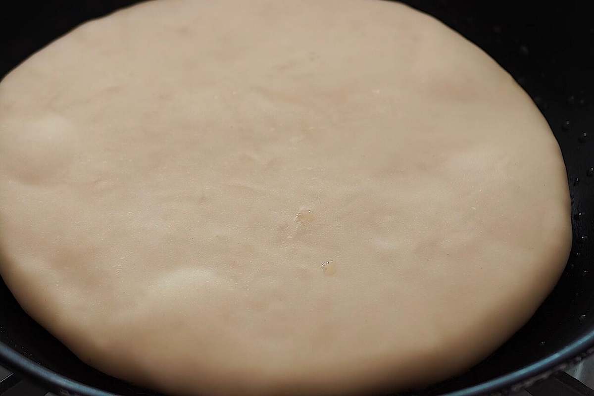 Umieść ciasto na natłuszczonej patelni. Całość należy smażyć na małym ogniu przez około 5 minut lub do uzyskania złotobrązowego koloru. Możesz urozmaicić ten naleśnik dodając włoskie zioła i inne składniki. Smacznego!