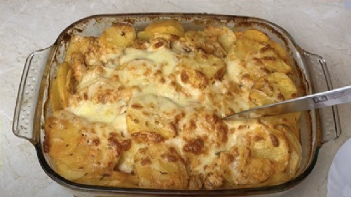1.Jedną łyżką oleju posmaruj formę do pieczenia. Na cienkie talarki pokrój obrane ziemniaki, później na blaszce je ułóż i dokładnie posól. Mięsem mielonym przykryj warstwę ziemniaków, a potem posyp cebulą i do smaku dopraw. Ostatnią warstwę ułóż na wierzch.