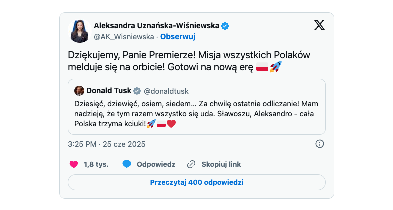 Na wpis Donalda Tuska odpowiedziała Aleksandra Wiśniewska-Uznańska – żona astronauty i posłanka Koalicji Obywatelskiej. W swoim poście podziękowała premierowi za wsparcie.