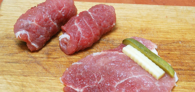 2. Po tym czasie, plastry mięsa oprósz solą i na każdym ułóż ogórka pokrojonego wcześniej wzdłuż na cztery części i kawałek sera, pokrojonego w kilkucentymetrowe słupki.