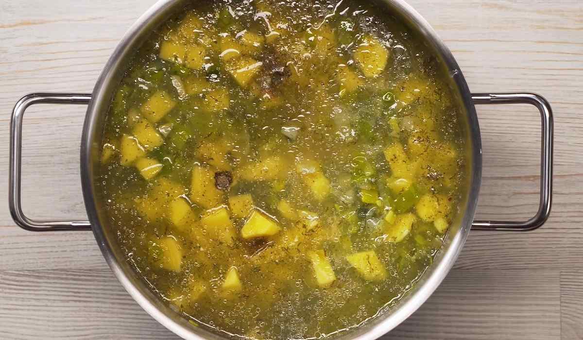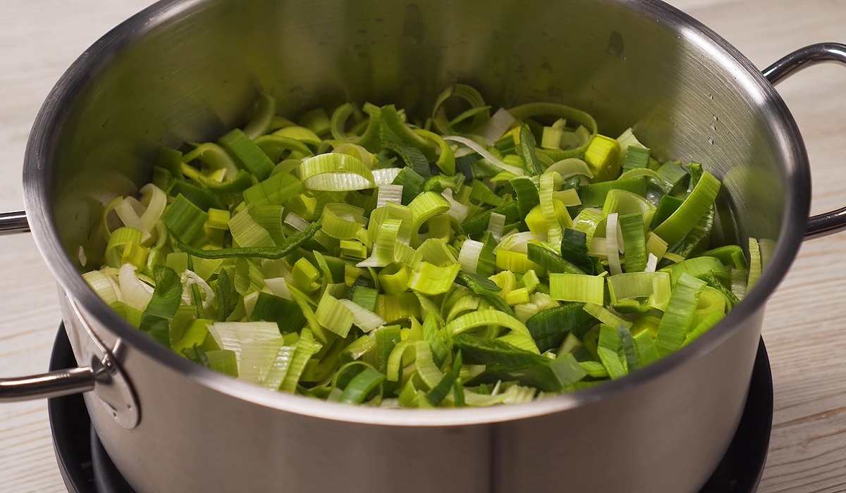 1. Go garnka wlej olej i smaż pokrojony por oraz posiekaną cebulę przez 5 minut.