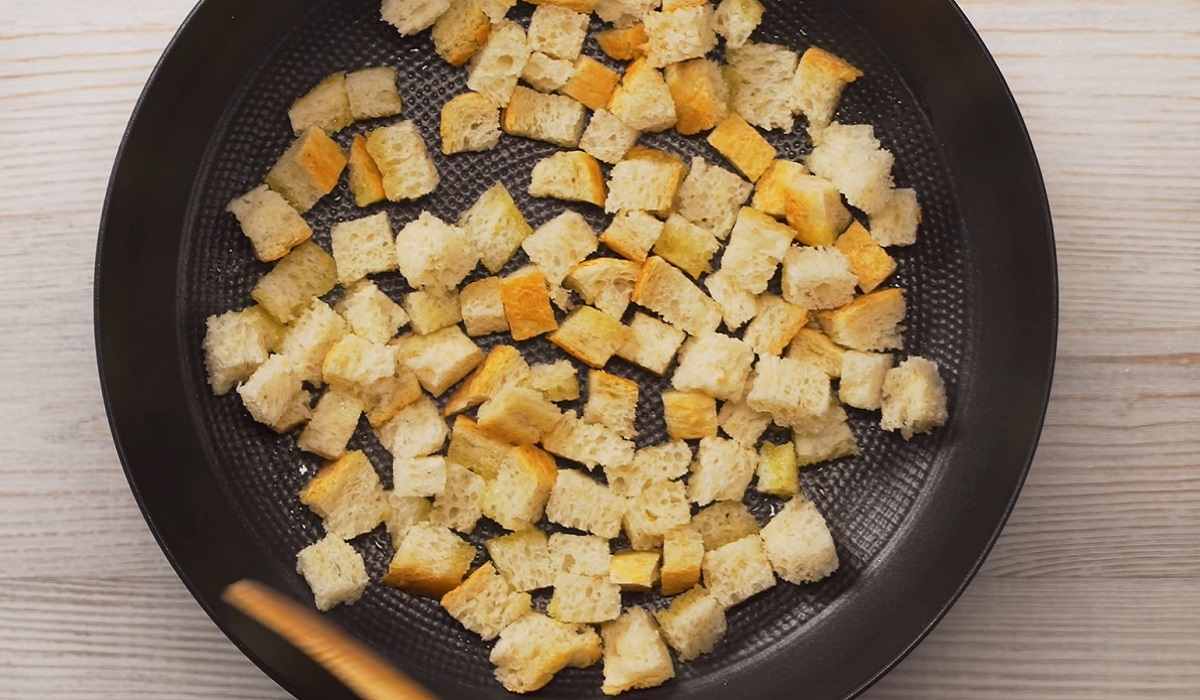 3. Chleb pokrój w kostkę o podsmaż na patelni z dodatkiem masła na złoty kolor.