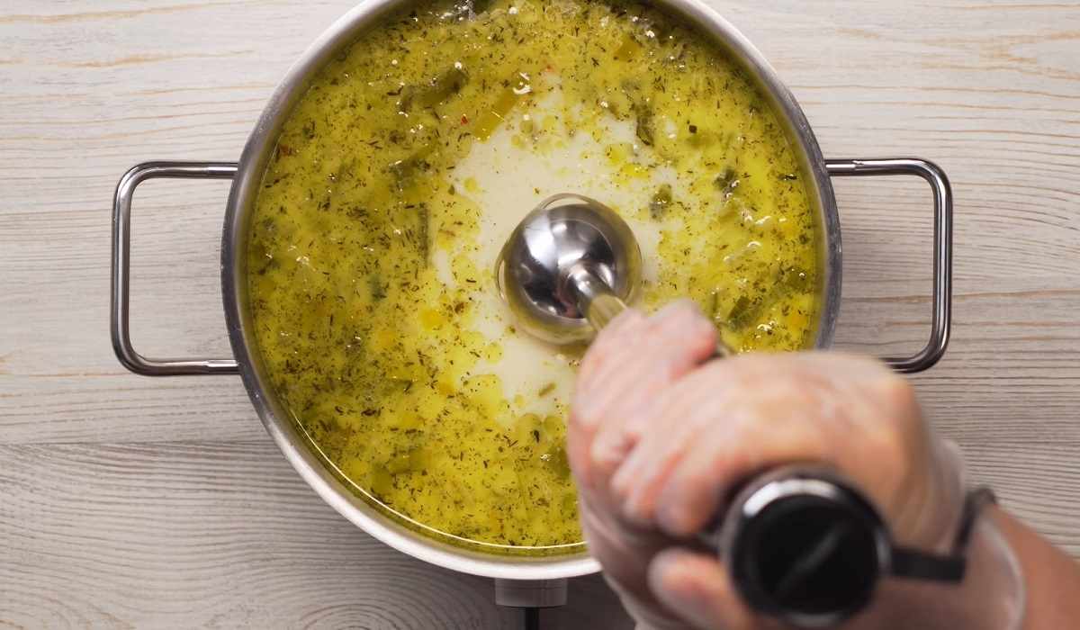 4. Dodaj śmietanę do gotowej zupy i dokładnie wymieszaj. Za pomocą blendera zmiksuj zupę na krem. To już wszystko!