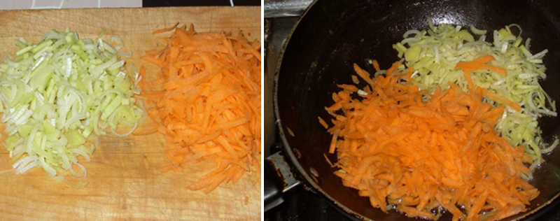 1. Na samym początku obierz dokładnie marchew i cebulę, następnie zetrzyj za pomocą tarki na grubych oczkach. Na dużej patelni rozpuść masło, następnie podsmażaj na niej starte warzywa przez kilka minut. W między czasie możesz pokroić na małą kosteczkę obrane oraz umyte ziemniaki.