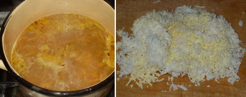 2. Na twardo ugotuj jajka, po czym za pomocą tarki zetrzyj je. Do garnka z gotującym się bulionem dodaj ziemniaki oraz groszek. Całość gotuj do momentu ,aż ziemniaki będą już miękkie. Podsmażone warzywa przełóż do garnka , po czym dodaj również stare jajka.