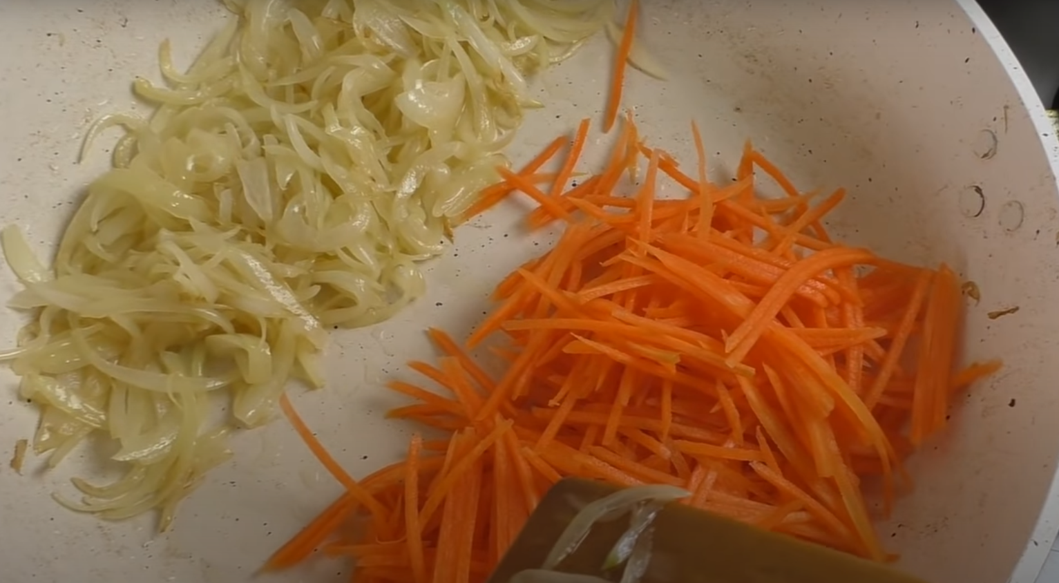 1. Na samym początku obierz cebulę i pokrój ją w paski. Smaż na patelni do momentu, aż się zeszkli. Marchew posiekaj i podsmaż ją na innej patelni.
