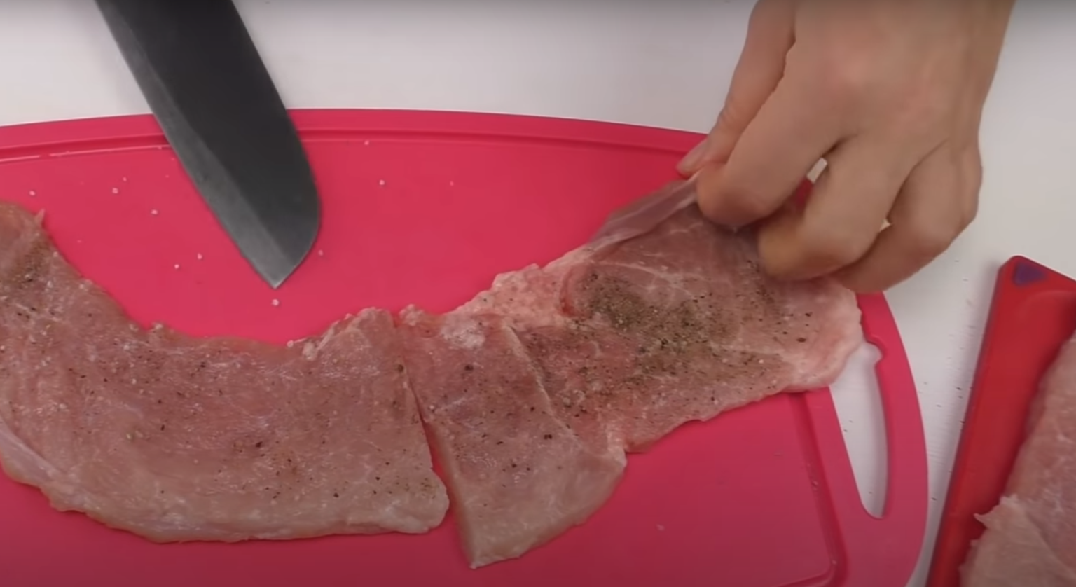 2. Kawałki mięsa porozbijaj na cienkie plastry. Aby mięso nie ubrudziło blatu używaj foli aluminiowej podczas rozbijania . Gotowe plastry mięsa posól i popieprz. Jeśli masz ochotę posyp je ulubionymi ziołami.
